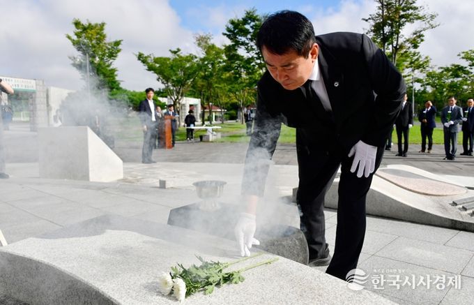 한국시사경제 광주취재본부 | 이정선 광주시교육감은 15일 광복80주년을 맞아 상무시민공원 광주독립운동기념탑을 참배했다.
