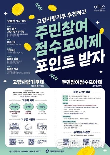 한국시사경제 광주취재본부 | 광주 동구는 관내 거주자와 사업장을 둔 주민을 대상으로 ‘고향사랑기부 주민참여점수모아제’를 홍보·운영하고 이를 통해 모금된 기부금을 활용해 지역에 활력을 불어넣고 주민 복리 증진에 기여하겠다고 밝혔다.