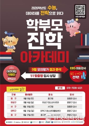 한국시사경제 대전취재본부 | 대전시는 오는 9월 13일 동구를 시작으로 14일 유성구, 20일 서구, 21일 대덕구, 27일 중구에서 ‘학부모 진학 아카데미’를 차례로 진행한다. 수능을 약 80일 앞둔 시점에서 불안을 낮추고 남은 기간 성과를 높일 수 있도록 실질적인 해법을 제시하는 데 초점을 맞췄다.