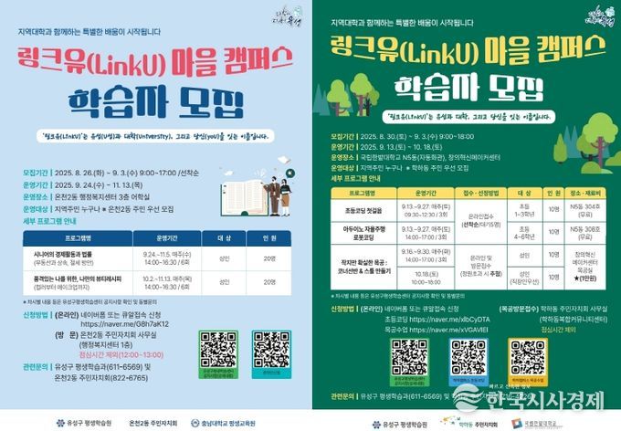 참여 신청은 네이버폼 또는 QR코드를 통해 가능하며, 각 동 주민을 대상으로 온천2동은 8월 26일, 학하동은 8월 30일부터 우선 모집한다. 자세한 사항은 유성구 평생학습과로 문의하면 된다.