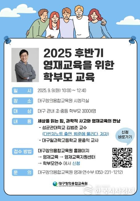 한국시사경제 대구취재본부 | 대구창의융합교육원 산하 대구과학영재교육원과 대구문예창작영재원은 9월 9일 오전 10시, 시청각실에서 ‘2025 후반기 영재교육 학부모 대상 특별 강연’에 참여할 초·중등 학부모 300명을 모집한다.