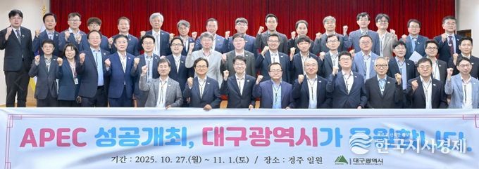 한국시사경제 대구취재본부 | 대구광역시는 8월 25일 열린 확대간부회의에서 대구경북 한뿌리 상생협력의 일환으로, 전 간부 공무원들이 홍보 배지를 착용하고 ‘2025년 APEC 정상회의’의 성공 개최를 응원했다.