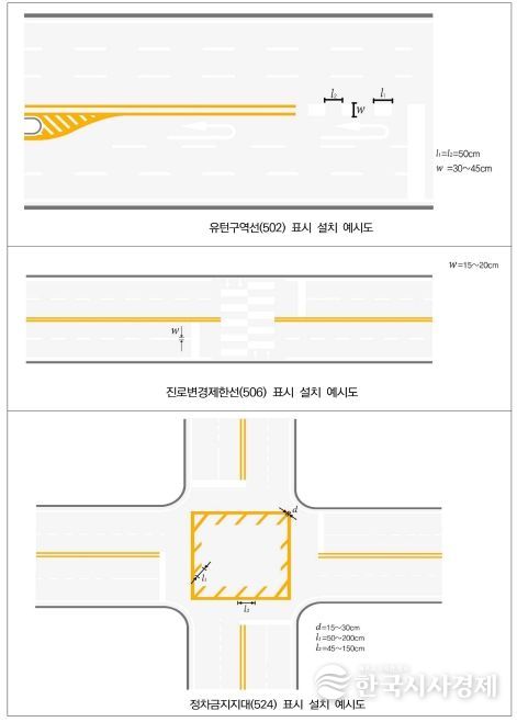 주요 개선 내용은 ▲원활한 유턴 유도를 위한 유턴구역선 길이 조정 ▲교차로 무리한 진입 방지를 위한 정차금지대 설치 ▲상습 정체 구간에서 끼어들기 억제를 위한 진로변경제한선 연장 ▲보행자 보호를 위한 횡단보도 전방 정지선 이격 확대(3m→5m) 등이다.