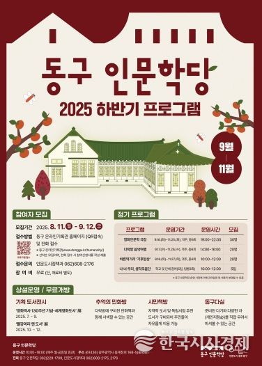 한국시사경제 광주취재본부 | 광주 동구는 오는 9월 12일까지 동구 인문학당의 ‘2025 하반기 프로그램’에 참여할 주민을 모집한다고 밝혔다.