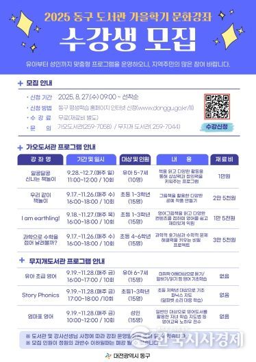 한국시사경제 대전취재본부 | 대전 동구는 다음 달부터 12월까지 운영되는 ‘2025년 도서관 가을학기 문화강좌’ 수강생을 모집한다고 27일 밝혔다.