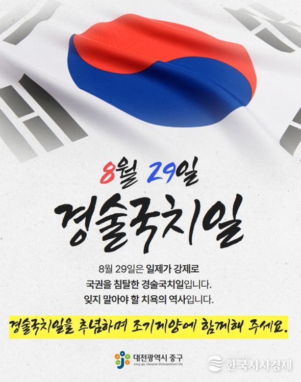 한국시사경제 대전취재본부 | 대전 중구는 8월 29일 경술국치일을 맞아 ‘조기 달기 운동’을 추진 한다.
