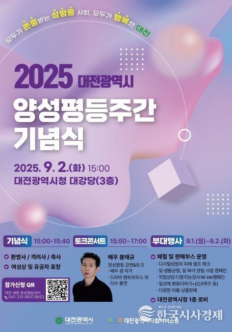 한국시사경제 대전취재본부 | 대전시는 2025년 양성평등주간을 맞아 오는 9월 1일부터 7일까지 기념주간을 운영하며, 이에 앞서 9월 1일부터 4일까지 시청과 대전YWCA 일대에서 다양한 행사를 개최한다.