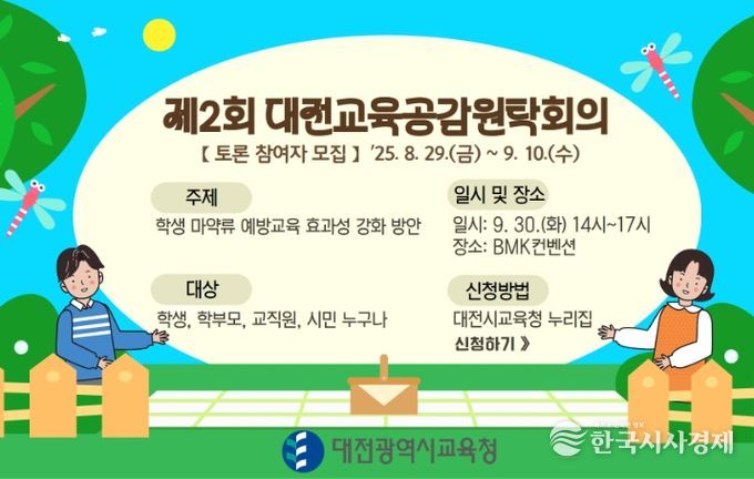 한국시사경제 대전취재본부 | 대전시교육청은 9월 30일 오후 2시 BMK컨벤션에서‘학생 마약류 예방교육 효과성 강화 방안’이라는 주제로'2025년 제2회 대전교육공감원탁회의'를 개최할 예정이며 토론회에 참여할 토론자를 모집한다고 밝혔다.