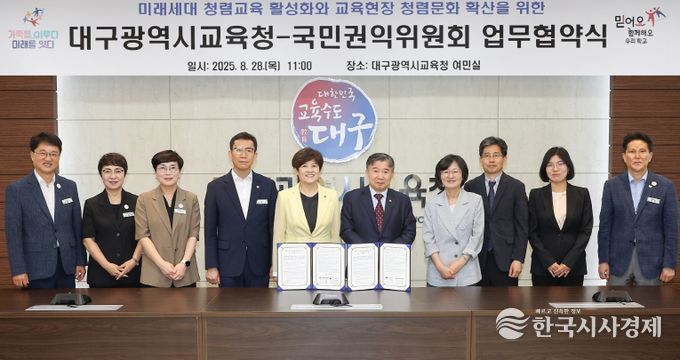한국시사경제 대구취재본부 | 대구시교육청은 8월 28일 오전 11시, 시교육청 접견실에서 국민권익위원회(위원장 유철환)와 ‘미래세대 청렴교육 활성화 및 교육현장 청렴문화 확산을 위한 업무 협약’을 체결했다.
