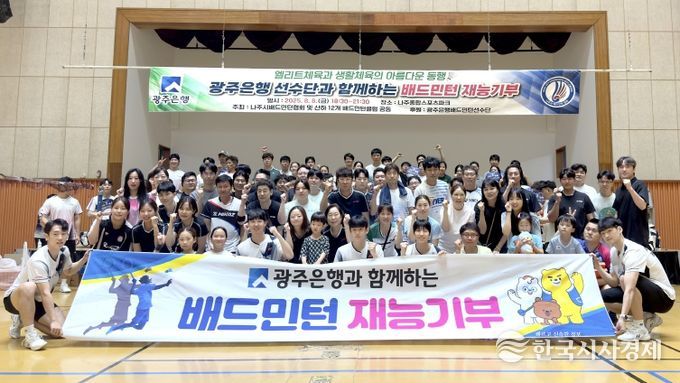한국시사경제 광주취재본부 | 광주은행(은행장 고병일)은 최근 광주은행 배드민턴 남자 실업팀 ‘비츠로 배드민턴단’이 나주시배드민턴협회 및 산하 12개 클럽 회원 100여 명을 대상으로 재능기부 봉사활동을 펼쳤다고 밝혔다.