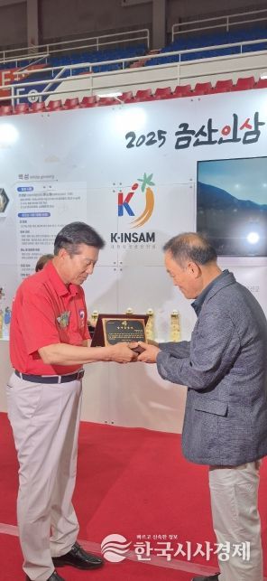 한국시사경제 김태훈 기자 | 금산군은 8월 28일 2025 금산인삼·푸드 울산 특별전 행사장에서 금산인삼의 우수성을 울산·경남 지역에 홍보하고 소비 활성화 등에 기여한 서상찬 강남기계공업(주) 회장에게 명예군민증을 수여했다.