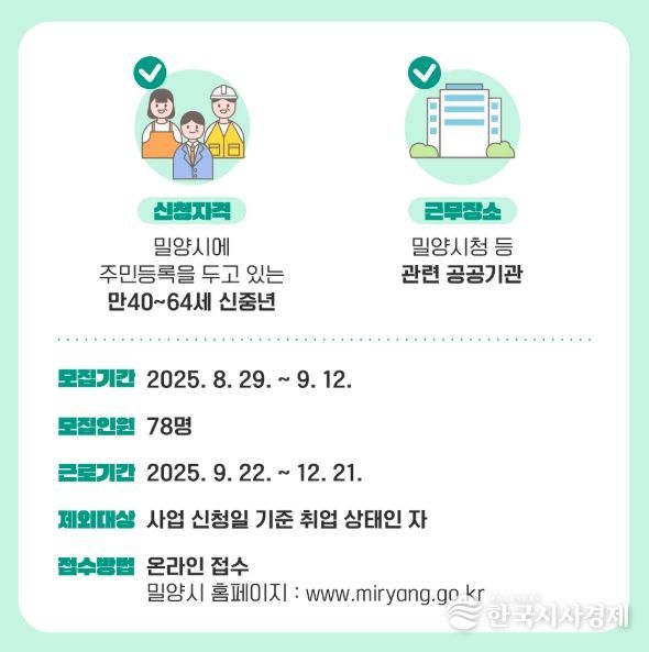 한국시사경제 김태훈 기자 | 밀양시는 신중년층의 사회참여 확대와 소득 공백 완화를 위해 ‘2025년 밀양형 신중년 아르바이트’ 참여자를 29일부터 9월 12일까지 모집한다고 밝혔다.
