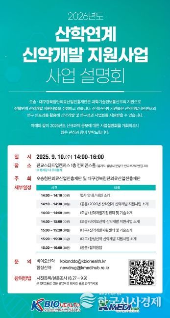 한국시사경제 대구취재본부 | 케이메디허브 신약개발지원센터가 내달 10일 오후 2시, 경기스타트업캠퍼스 컨퍼런스홀에서 ‘2026년 산학연계 신약개발 지원사업 신규과제 설명회’를 개최한다.