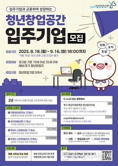 문인 북구청장은 “이번 모집에 역량 있는 청년 창업가들의 많은 관심과 참여를 바란다”며 “앞으로도 청년들이 안정적으로 창업에 도전할 수 있는 북구를 조성하기 위해 다양한 지원을 아끼지 않겠다”고 말했다.