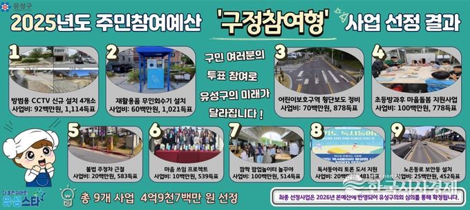 투표에는 2,367명의 구민이 참여해 1인당 3표씩 행사했으며, 그 결과 4억 9,700만 원 규모의 9개 사업이 선정됐다. 선정된 사업은 2026년도 본예산안에 반영돼 유성구의회의 심의를 거쳐 최종 확정될 예정이다.