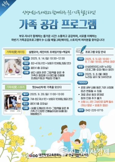 한국시사경제 대전취재본부 | 대전학생교육문화원 부설 산성어린이도서관은 가족 간 소통 기회 확대를 위해 유초등학생 자녀와 부모가 함께하는 하반기 '가족 공감 프로그램'을 9월부터 운영한다고 밝혔다.