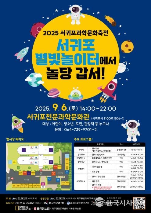 한국시사경제 김숙영 기자 | 서귀포시는 '2025 서귀포과학문화축전'을 오는 9월 6일 14시부터 22시까지 서귀포천문과학문화관(서귀포시 1100로 506-1)에서 개최한다.