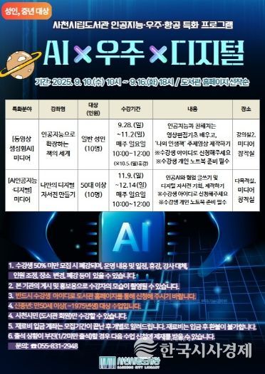 참여 신청은 9월 10일 오전 10시부터 9월 16일 오후 6시까지 사천시립도서관 홈페이지에서 선착순 접수로 이뤄진다.