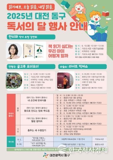 한국시사경제 대전취재본부 | 대전 동구는 9월 독서의 달을 맞아 ‘읽기예보, 오늘 읽음, 내일 맑음’이라는 슬로건 아래, 구민 누구나 함께할 수 있는 다채로운 독서 문화 행사를 개최한다고 2일 밝혔다.