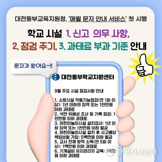 한국시사경제 대전취재본부 | 대전동부교육지원청은 9월 4일부터 관내 교직원 270여 명을 대상으로 학교 시설 주요 점검사항을 매월 사전에 발송하는 ‘문자 안내 서비스’를 처음으로 시행한다고 밝혔다.