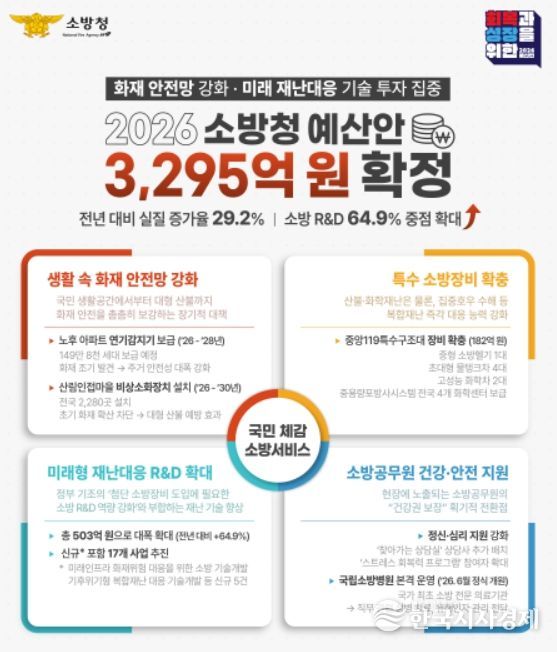 한국시사경제 오영주 기자 | 소방청은 민생 안정과 재정혁신, 미래 성장동력 확보라는 정부 기조에 발맞춰 2026년도 정부 예산안으로 총 3,295억 원을 확정했다고 2일 밝혔다. 이번 예산은 국민의 생활과 직결된 안전망을 촘촘히 보강하고, 첨단 재난대응 기술에 대한 투자를 확대하겠다는 소방청의 강한 의지를 담고 있다.