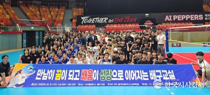 한국시사경제 광주취재본부 | 광주시교육청과 페퍼저축은행 AI 페퍼스 배구단은 3일 페퍼 스타디움에서 ‘학교스포츠클럽 배구교실’을 운영했다.
