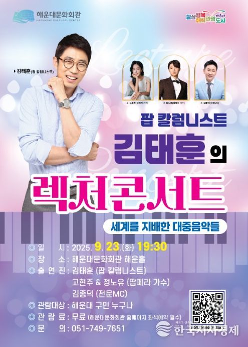 한국시사경제 김태훈 기자 | 해운대문화회관은 23일 오후 7시 30분 해운홀에 서 ‘팝 칼럼니스트 김태훈의 렉처콘서트’를 개최한다.