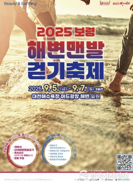 ‘2025 보령 해변맨발걷기축제’는 9월 5일부터 9월 7일까지 대천해수욕장 머드광장 및 해변 일원에서 진행되며, ▲선셋 해변맨발걷기 ▲맨발걷기 해양치유포럼 ▲해변놀이터 등 다채로운 프로그램으로 진행될 예정이다.