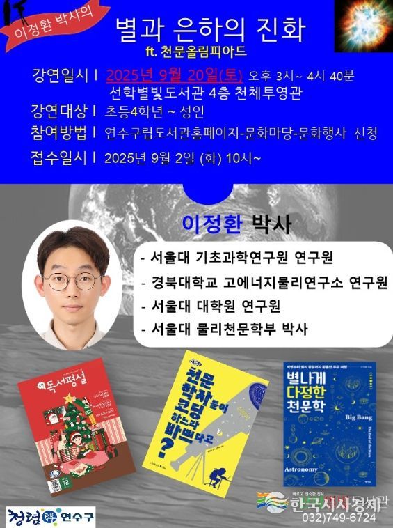 도서관 관계자는 “이번 강연은 허블과 제임스웹 우주망원경이 촬영한 경이로운 천체 사진과 함께 별과 은하의 진화과정을 생생하게 전달할 것으로 기대한다.”라며 “우주에 대한 호기심을 자극하고, 천문학자를 꿈꾸는 학생들에게 진로 소개의 기회도 제공될 예정이다.”라고 덧붙였다.