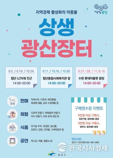 광산구 관계자는 “‘상생광산장터’는 지역 사회적 경제 기업과 소상공인, 시민이 함께 지역 경제와 사회를 함께 건강하게 하는 가치를 나누고, 확산하는 장”이라며 “지역 경제 활성화의 마중물이 되도록 많은 시민의 관심과 참여를 바란다”고 말했다.