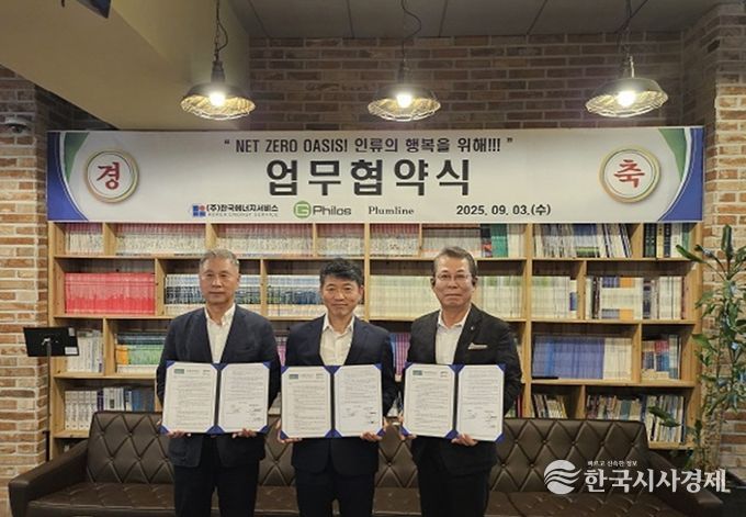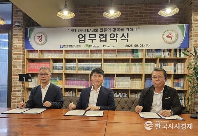 한국시사경제 권충언 기자 | 2025년 9월 4일, ㈜한국에너지서비스(대표 김영직)는 컨설팅 기업 Plumline(대표 신이철), ㈜지필로스(대표 박가우)와 함께 가칭 ‘Net Zero Oasis’ 통합 신재생에너지 플랫폼의 공동 개발과 보급을 위해 9월 3일 3자 업무협약(MOU)을 체결했다.