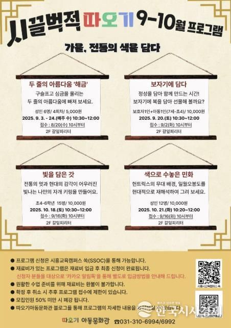 한국시사경제 경기취재본부 | 시흥시 따오기아동문화관이 9월부터 10월까지 ‘전통’을 주제로 한 특별ㆍ상설프로그램을 운영한다. 이번 프로그램은 최근 흥행 중인 애니메이션 케이팝 데몬 헌터스의 인기로 높아진 전통문화 관심과 맞물려, 깊어 가는 가을에 아이들과 가족이 함께 우리 문화의 아름다움을 체험할 수 있도록 마련됐다.