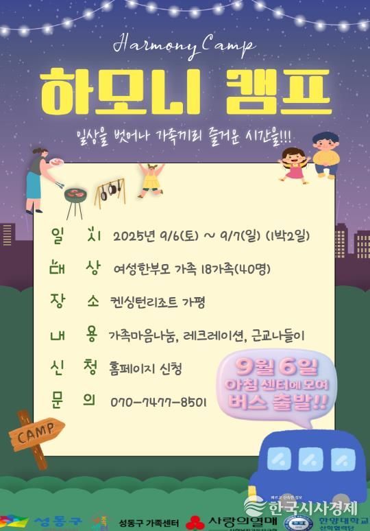 한국시사경제 윤광희 기자 | 서울 성동구는 여성한부모 가족의 정서적 안정과 가족 유대 강화를 위해 오는 9월 6일부터 7일까지 1박 2일 일정으로 '하모니 캠프'를 개최한다고 밝혔다.