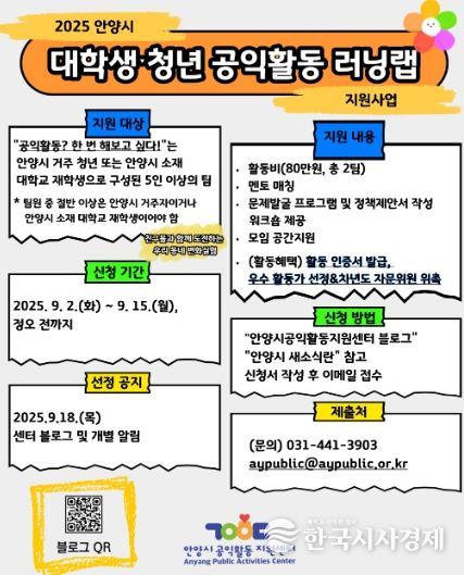 한국시사경제 경기취재본부 | 안양시공익활동지원센터는 대학생과 청년이 지역사회의 문제를 발견하고 직접 해결 아이디어를 실험할 수 있도록 돕는 ‘대학생·청년 공익활동 러닝랩’ 참여팀 또는 학과 동아리를 오는 15일 12시까지 모집한다고 밝혔다.