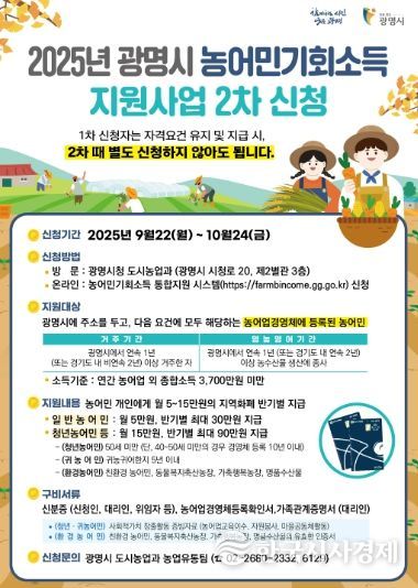 한국시사경제 경기취재본부 | 광명시는 오는 22일부터 10월 24일까지 ‘2025년 2차 농어민 기회소득 지원사업’ 신청을 받는다.