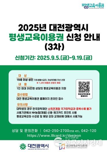한국시사경제 대전취재본부 | 대전시와 대전평생교육진흥원은 평생교육이용권 지원 대상자 282명을 추가 모집한다고 7일 밝혔다. 신청 기간은 9월 5일부터 19일까지이며, 19세 이상 대전 시민이면 누구나 대전평생교육이용권 홈페이지를 통해 온라인 신청할 수 있다.