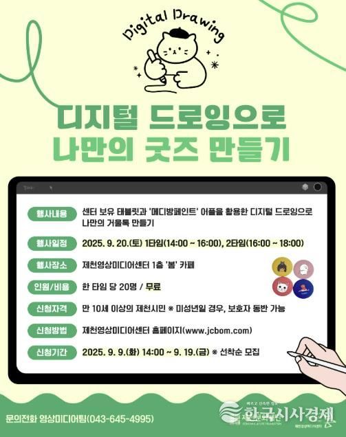 한국시사경제 충북취재본부 | 제천문화재단은 오는 20일 제천영상미디어센터 1층 ‘봄’ 카페에서 '디지털 드로잉으로 나만의 굿즈 만들기' 프로그램을 진행한다.