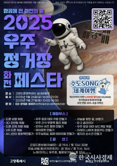한국시사경제 윤광희 기자 | 고양특례시는 한국항공대학교, 화전마을관리사회적협동조합과 공동으로 오는 26~27일 이틀간 고양드론앵커센터와 한국항공대학교 일대에서 ‘2025 우주정거장 화전 페스타'를 개최한다.