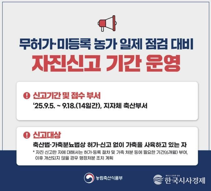 자진신고를 한 농가에는 가축 처분 등에 필요한 시정 기간을 최대 6개월까지 부여할 예정이다. 반면, 신고 기간 이후 적발된 농가는 관련 법령에 따라 고발 및 과태료 부과 등 엄정한 조치가 이뤄질 예정이다.