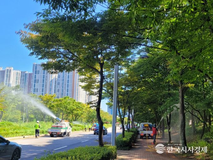 한국시사경제 윤광희 기자 | 연수구는 전국적으로 미국흰불나방 2화기 유충 피해가 확산함에 따라 지난 5일 송도도시관리과와 공원녹지과, 연수구시설안전관리공단은 관내 공원과 녹지 일대에서 합동 방제 작업을 진행했다.
