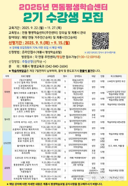 한국시사경제 김태훈 기자 | 계룡시는 ‘2025년 면동 평생학습센터 2기 프로그램’ 수강생을 오는 9일부터 오는 15일까지 모집한다.
