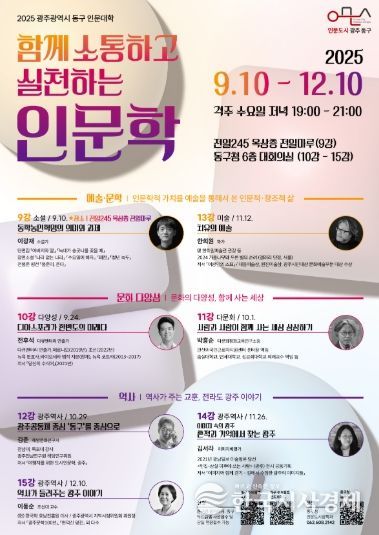 이어 ▲전후석 다큐멘터리 연출가 ‘디아스포라가 한반도의 미래다’(9월 24일) ▲박흥순 다문화평화교육연구소장 ‘사람과 사람이 함께 사는 세상 상상하기’(10월 1일) ▲김준 해양문화연구자 ‘광주공동체 중심 동구를 중심으로’(10월 29일) ▲한희원 화가 ‘치유의 미술’(11월 12일) ▲김서라 이미지 비평가 ‘흔적과 기억에서 찾는 광주’(11월 26일) ▲이동순 조선대 교수 ‘역사가 들려주는 광주 이야기’(12월 10일) 등이 구청 6층 대회의실에서 열린다.