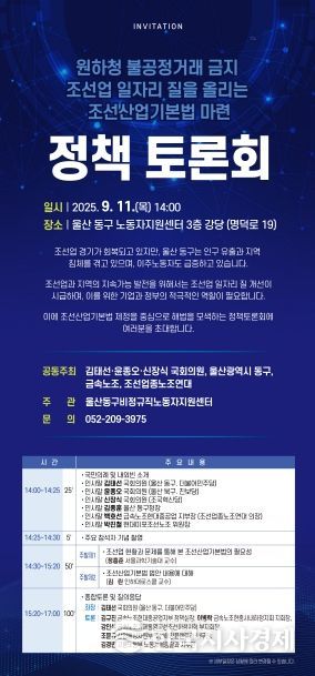 한국시사경제 울산취재본부 | 울산 동구는 오는 9월 11일 오후 2시 울산동구비정규직노동자지원센터 3층 강당에서 ‘조선산업기본법 마련 정책토론회’를 개최한다. 이번 정책토론회는 김태선 더불어민주당 국회의원, 윤종오 진보당 국회의원, 신장식 조국혁신당 국회의원과 울산광역시 동구, 금속노조, 조선업종노조연대 공동주최 행사로, 울산동구비정규직노동자지원센터가 주관한다.