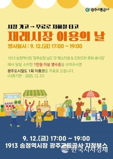 한편 공사는 이번 행사를 시작으로 10월 양동시장, 11월 남광주시장 등 역세권 인근 시장을 대상으로 ‘재래시장 이용의 날’을 순차적으로 추진, 민생 회복과 녹색 교통수단 활성화에 이바지할 계획이다.