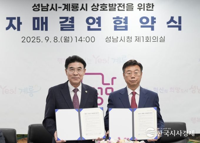한국시사경제 경기취재본부 | 성남시는 9월 8일 충청남도 계룡시와 우호·교류 증진과 동반 성장을 위한 자매결연 협약을 체결했다.
