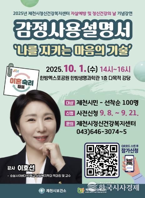 강연은 제천시민 누구나 참여할 수 있으며, 참여를 원하는 시민은 9월 21일까지 제천시정신건강복지센터 누리집 또는 홍보물 내 큐알(QR)코드를 통해 사전 신청하면 된다.