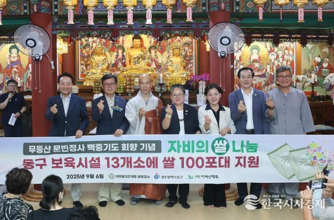 한국시사경제 광주취재본부 | 광주 동구는 지난 6일 백중(百中·음력 7월 15일) 당일에 문빈정사에서 열린 백중회향기도를 기념해 백미 100포(10㎏)를 지역 아동복지시설에 전달하는 이웃사랑 나눔 전달식을 개최했다고 밝혔다.