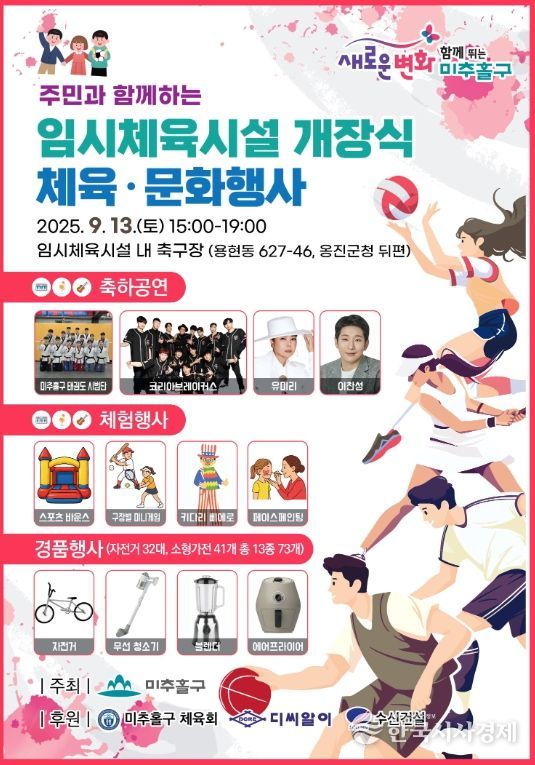한국시사경제 윤광희 기자 | 인천 미추홀구는 오는 13일 용현동 627-46 부지에 조성된 임시체육시설에서 개장 기념 체육문화 행사를 개최한다.