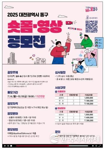 한국시사경제 대전취재본부 | 대전 동구는 인구감소 위기에 대한 공감대 확산과 구의 인구정책 홍보를 위해 추진 중인 ‘2025 동구 인구정책 숏폼·영상 공모전’의 접수 기간을 당초 9월 12일에서 10월 10일까지로 연장한다고 9일 밝혔다.
