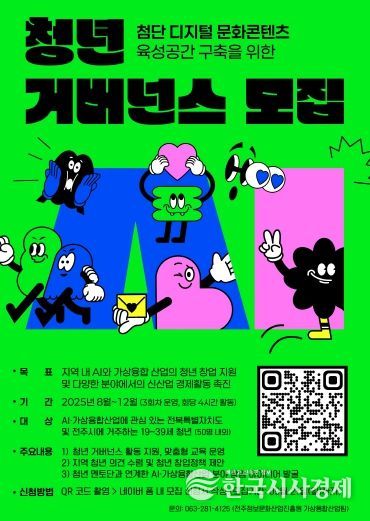한국시사경제 전북취재본부 | 전주정보문화산업진흥원은 지역 청년들의 AI·가상융합산업 분야 창업 역량 강화를 위한 ‘청년 거버넌스 참여단’을 공개 모집한다고 9일 밝혔다.